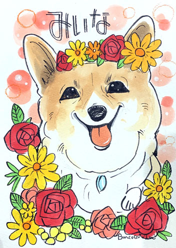 朝一番にご来店くださったお客様。ワンチャン三匹と息子さんと愛犬の似顔絵をご依頼いただきました。動物好きのぶんちゃんにおまかせ!