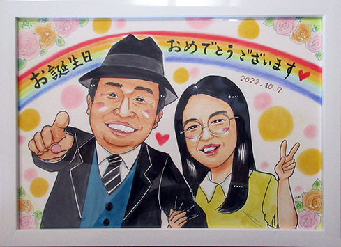 一枚は10年前くらいの画像を描いたもの。もう一枚はご本人の要望によって今の2人を描いたものです。