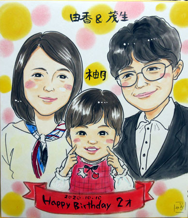 ご家族での似顔絵をご依頼いただきました。結婚記念とお子様との似顔絵だそうです。これから、子供さんの成長とともにまた似顔絵も増えていくといいですね。