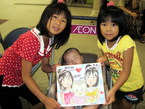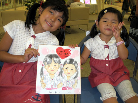こちらは三回目のリピーターさん。最初はご夫婦でお描きし、二度目は奥様のプレゼントに。そして、可愛らしい姫君と一緒の家族似顔絵です。ご家族の歴史の1ページに関わることが出来て、嬉しいです>△<。子育ては大変ですけど、たくさん泣いたり笑ったりして宝物になる時間を過ごして下さいね!
