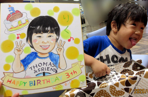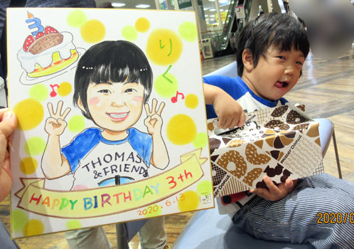 最初のお客様。リピーター様で今回久しぶりの似顔絵です。4歳になったんですね。