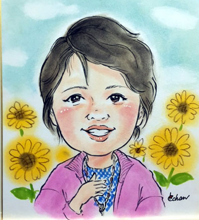 ひまわりが好きだというご希望で、ひまわりを背景に。素敵な奥様と楽しくお話ししながら描かせていただきました。