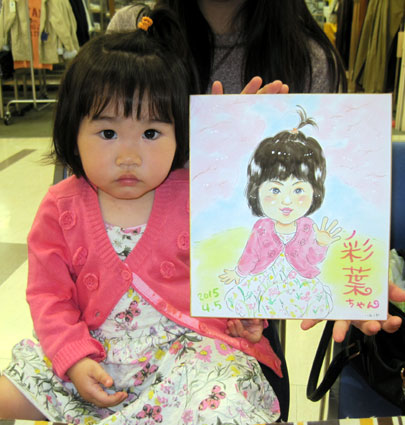 こちらは、親子さんアンドおばさまの三人似顔絵です。とっても写真の笑顔が可愛らしいこどもちゃんで、すっごい描いてても楽しかったです。こんなにちっちゃくっても、もうお写真を一緒に撮ってもらえないそうで、似顔絵だけでも思い出にということでした〜。ああ、可愛い時はちょっとだけなのが辛いですね。