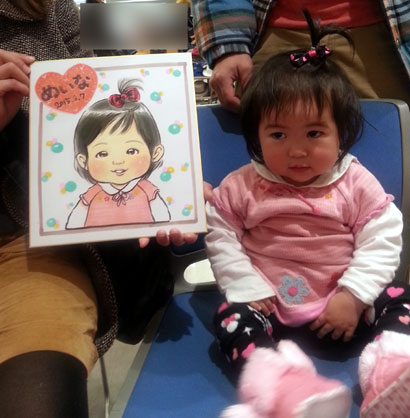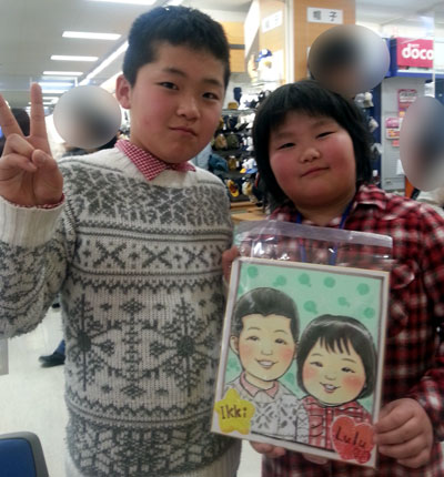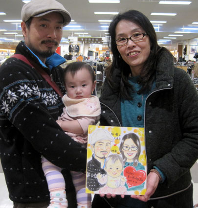 ご家族での似顔絵です〜。可愛らしいお子さんとの初めての似顔絵とのこと。ありがたいですね〜。ぜひ、また来年もお待ちしております〜。