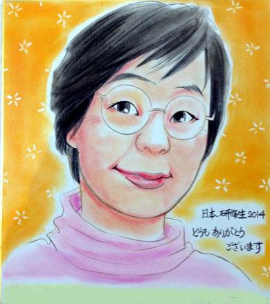 うまく表現したとてもいい似顔絵を描いてくださいます。パンパステルというちょっと珍しい画材で彩色されるのも、是非皆さんにご覧いただけると、楽しいかも?!。