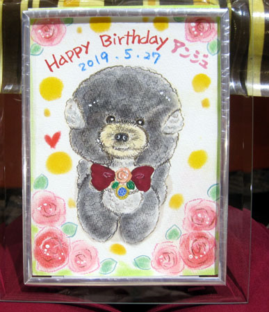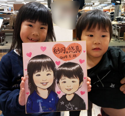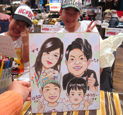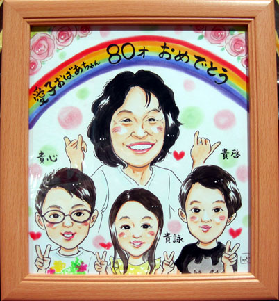 こちらは、傘寿のお祝いの似顔絵です。とってもエネルギッシュなおばあちゃんへのプレゼントに、とのご依頼でした。お孫ちゃんたちも可愛いかったです。今回は、割ときょうだいのお客様が多かったなあ。またのご来店もお待ちしてま〜す。