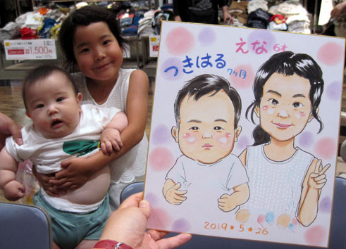 こちらは、姉弟ちゃんの似顔絵です。弟君が落っこちないようにお姉ちゃんがしっかり抱っこ。お腹見えちゃったけど・・・