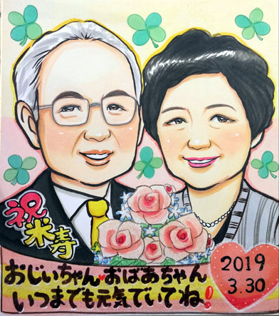 ご両親への還暦のお祝いにお孫さんとの似顔絵をご依頼下さいました。