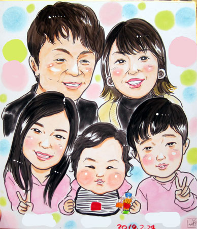 前日にご家族に似顔絵をお描きしたお客様より今度はご両親へのプレゼントにという