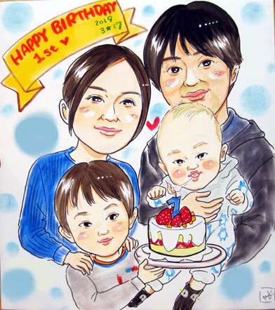 こちらはご家族似顔絵。初めてのお子さんとの家族似顔絵ですねえ。