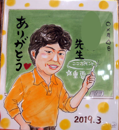 こちらは受験生で、受験も決まり卒業のお礼の似顔絵。塾の先生へのお礼だそうです。