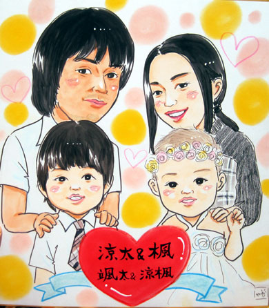 ご家族似顔絵です。可愛らしいお子さんと素敵なご夫婦さん。