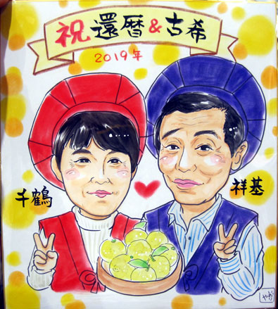 お父さんの古希のお祝いに、お孫ちゃんとの似顔絵を、とのことでした。