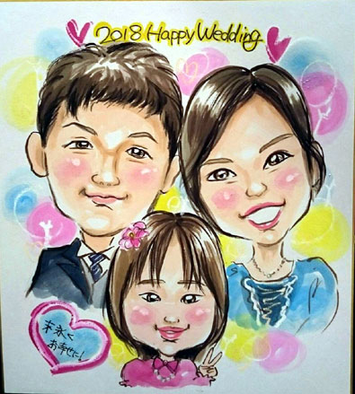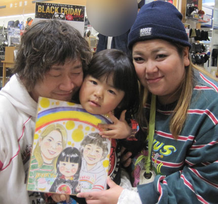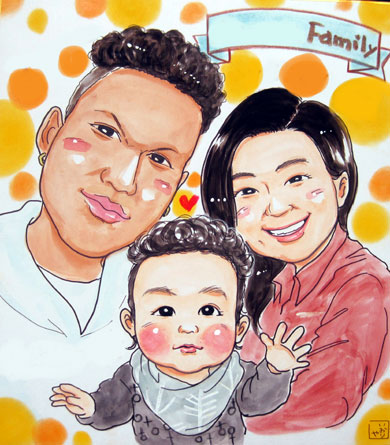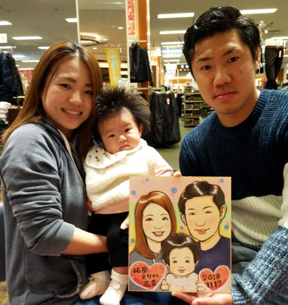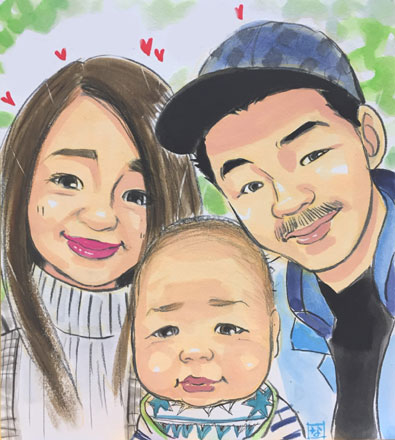 若いご家族似顔絵です。両親の愛情をたくさんもらって、元気に成長してくださいね〜。またのご来店をお待ちしております。