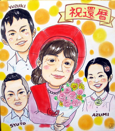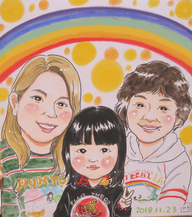 ご家族での似顔絵です。フッワフワのヘアースタイルが愛らしくて、ほほえましいです。