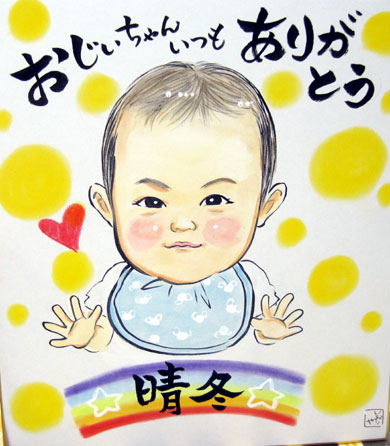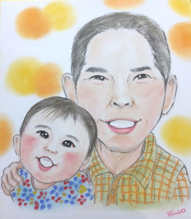 こちらはおじいちゃんとお孫ちゃんの似顔絵です。ちょっと若く描いてくださいね、というご依頼で、若返ったおじいちゃん。素敵なプレゼントになりますように。