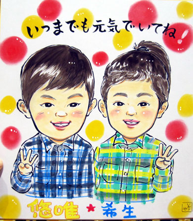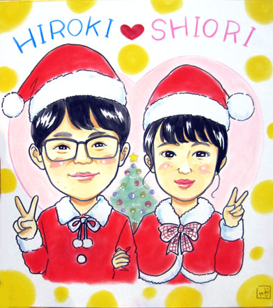 こちらは新婚さんご夫婦の似顔絵です。とっても仲良い優しい雰囲気のお二人で、ほんわか描かせていただきました。クリスマスが記念日だそうです。これから先も、二人でしっかりと楽しみながら時間を重ねてくださいね〜。