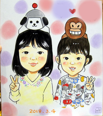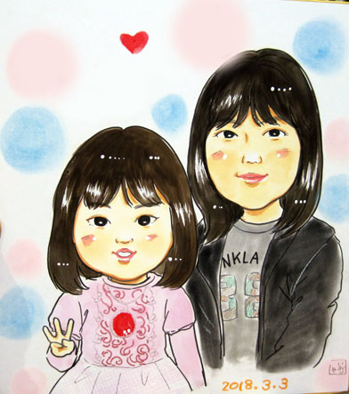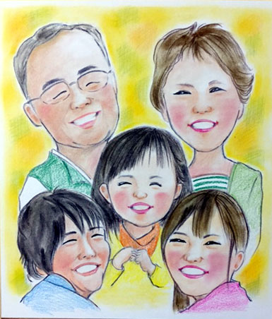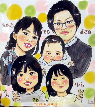 五人家族の似顔絵です。三姉妹の元気な成長が楽しみですね。