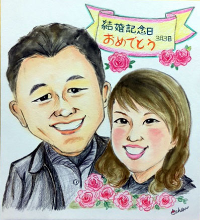 いつもかわいいお子さんを描くのが大好きなechanさんに、お写真からのご依頼の結婚記念の似顔絵をお願いしました。とても素敵な似顔絵です。これからも素敵なご夫婦でいて欲しいですね〜。