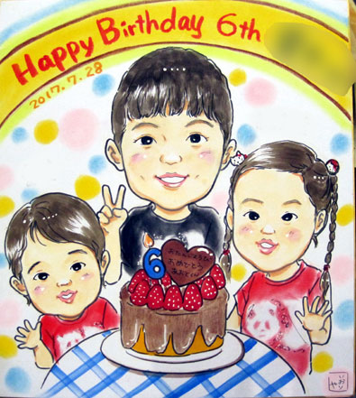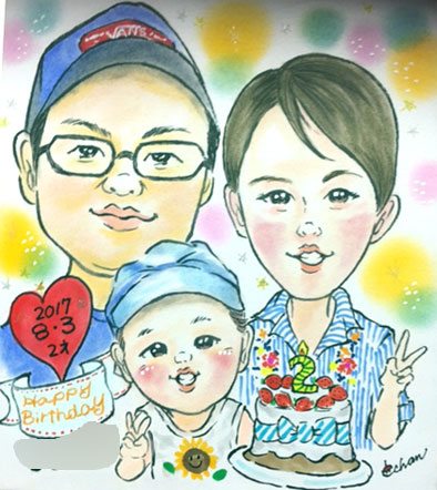 ご家族での似顔絵です。お誕生日記念に。