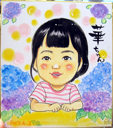 初めての似顔絵だそうです。6月だったので、紫陽花をバックにしてみました。