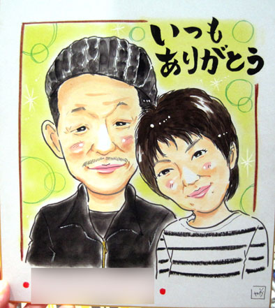 こちらは素敵な家族の似顔絵です。お花が可愛らしいお二人にGOOD!