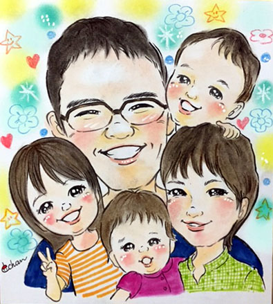 ご家族での似顔絵です。母の日の記念にとのことでした。可愛らしいお子さんの成長と共に、ぜひ素敵な似顔絵も増えていくといいなあ。