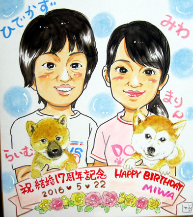 ご結婚記念&奥様の誕生日にという粋なご主人の似顔絵プレゼントです。かわいい2匹の愛犬柴犬ちゃんたちも、ほっこりするぐらいに可愛らしかったです