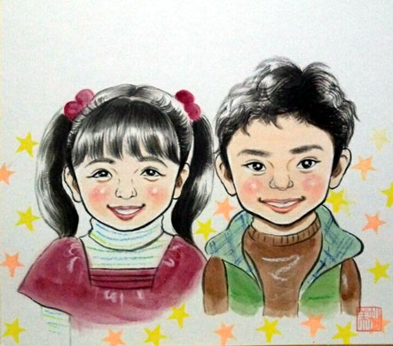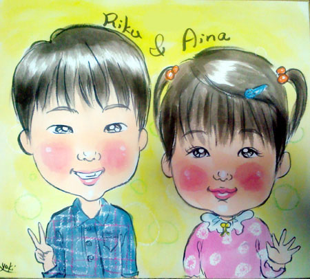 ちょっと年の差姉妹ちゃんの似顔絵です。仲良し姉妹って、微笑ましいですね〜。