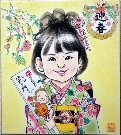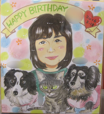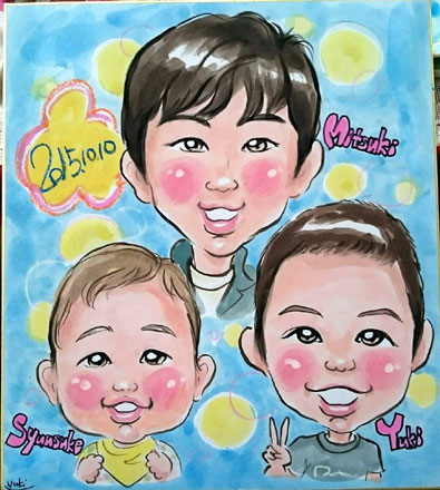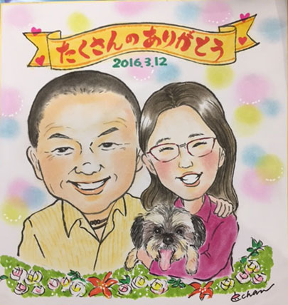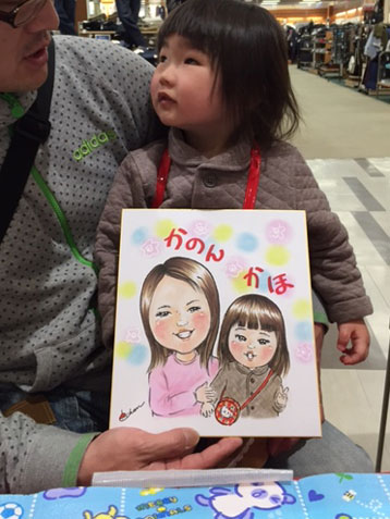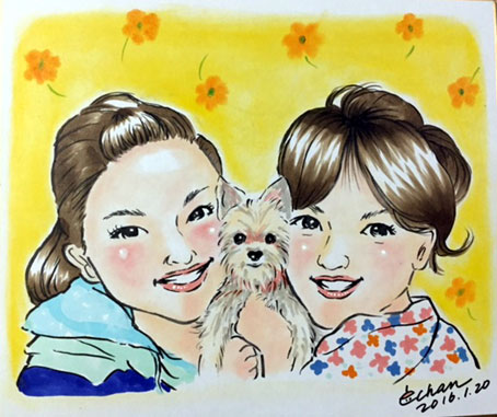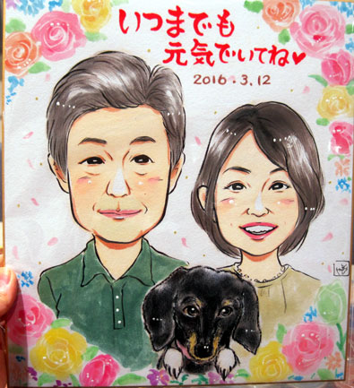 還暦のお祝いにということで描かせていただきましたが、ちょうどお子さんもいらっしゃって、娘さん二人も、と別注文をいただきました。とっても可愛い娘さんたちでした〜。ご両親も素敵な方なので、記念の一枚になるといいなあ。