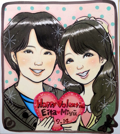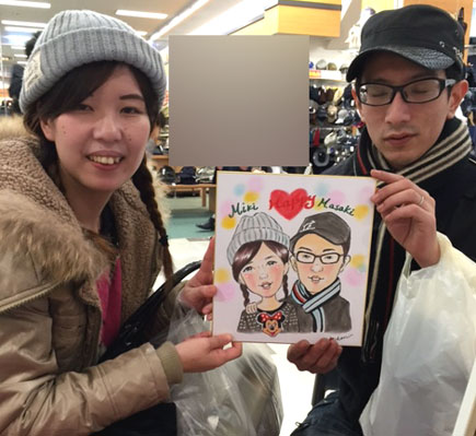 とっても素敵なカップルさんでした。笑顔が素敵〜。ぜひこれからも仲良くまた似顔絵にお越しいただける日を楽しみにしています。