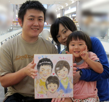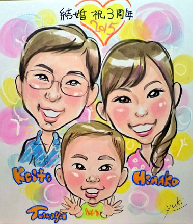 こちらは挙式予定のための似顔絵依頼でした。お子ちゃんのこれまたキュートな様子も微笑ましいご夫婦の雰囲気も、とっても幸せなパワーをいただきました。ありがとうございます。