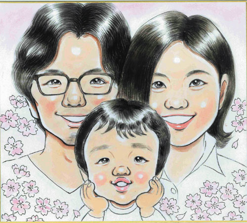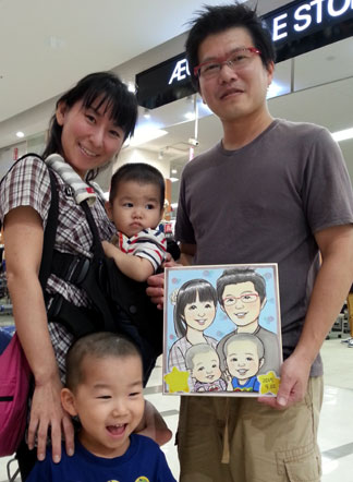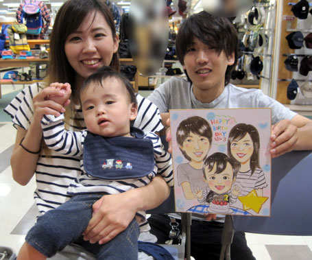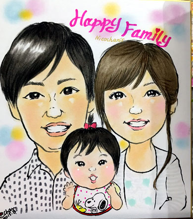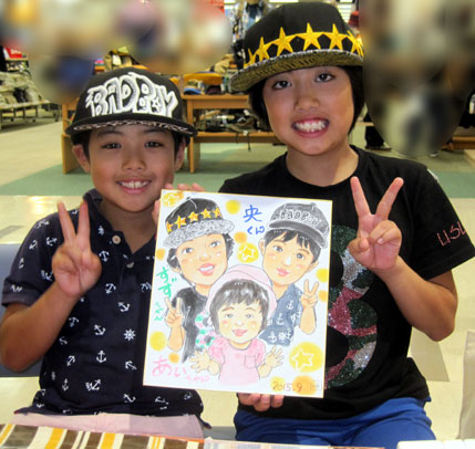 家族での似顔絵です。子供達の笑顔が可愛くてこちらまでニコニコになりますね。