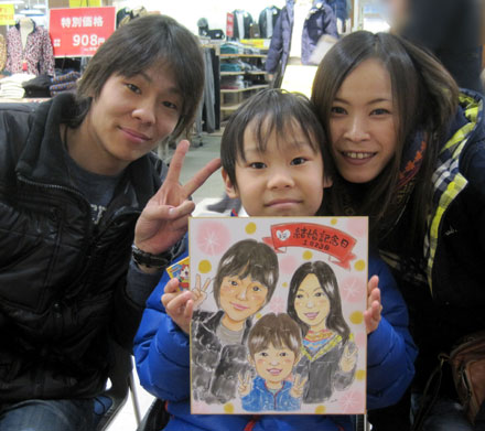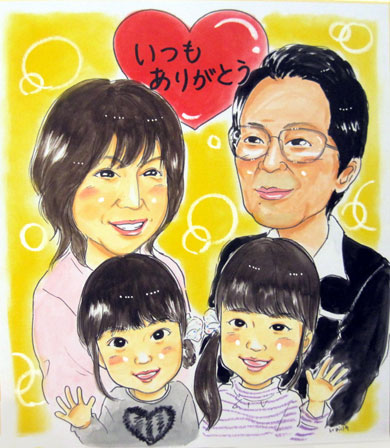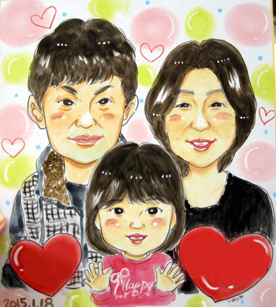 こちらも家族似顔絵です。1年前に母娘さんで一度描かせていただいたことがあって、今回は家族での似顔ですね。元気でまた一年後に大きくなって会えるのを楽しみにしていますよ〜。