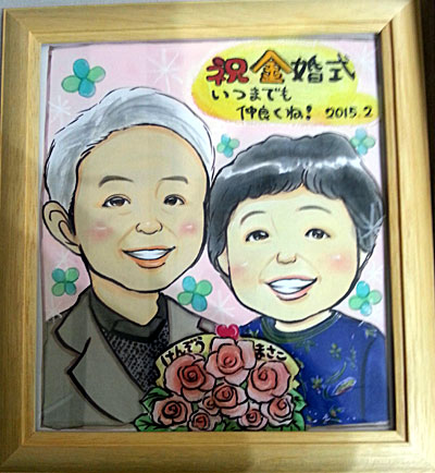 こちらは、金婚式のお二人へのプレゼントだそうです。金婚式・・・50年目ですか。素晴らしいですね。長く過ごすには様々な出来事を経て今ここにいるということ、ともにあることに感謝したいし元気でいて欲しいです。これからも60年70年と末長く共にお元気で。