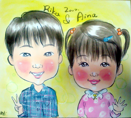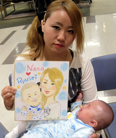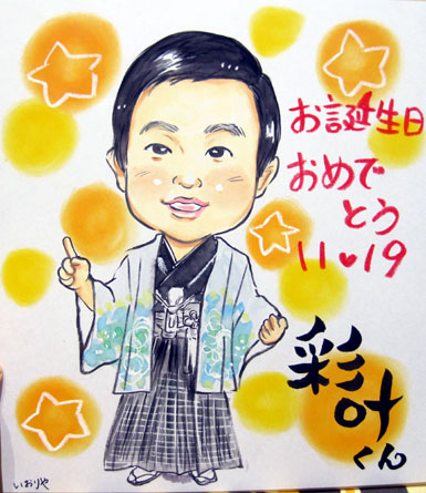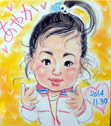 お誕生日の記念にという似顔絵ですね〜。元気ですくすくとおきくなってくださいね。