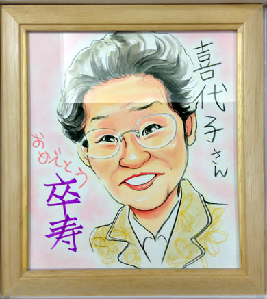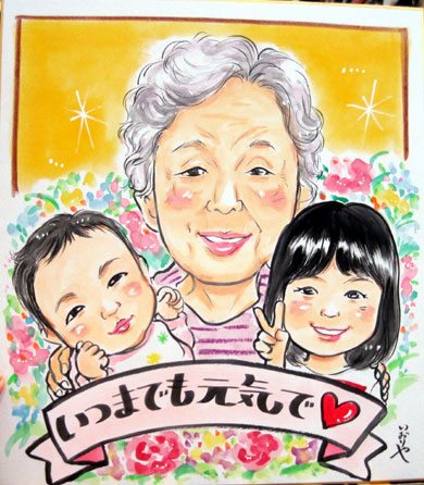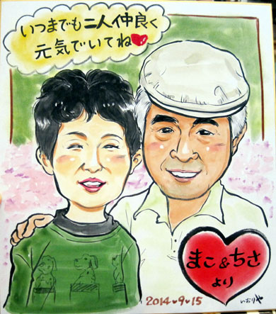 ご両親へのプレゼントだそうです、大好きな可愛いお孫ちゃんとの似顔絵です。可愛いお孫ちゃんにメロメロになる気持ち分かりますわ〜。