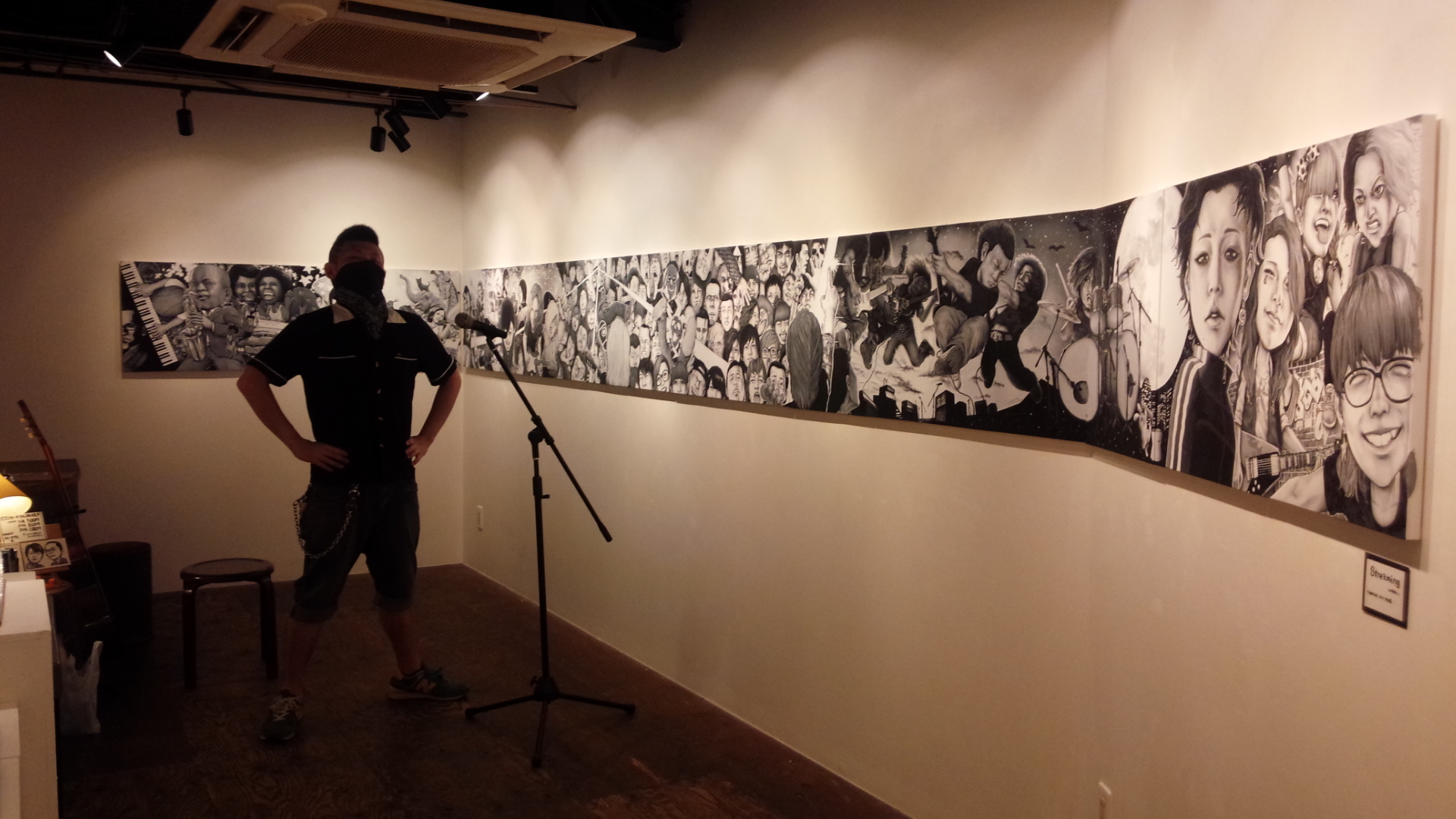 ギャラリーは可愛らしいスペースでしたけど、青木さんの絵のもつ迫力が、音声付きで聞こえそうなくらい、リアルでした。ぐるりと壁を取り囲んだ壁面に向かって立つスタンドマイクの前に立つと、自分も絵の中にいるような錯覚にとらわれます。バンドには詳しくないので、そのあたりは不勉強なのでわかりませんが、ライブの熱気が渦巻いてます。しかも、すべてモノクロというのも青木さんの凄さをまた感じさせられる個展でした。