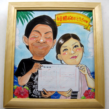 新婚さんのおもしろ似顔絵。とっても構図がおもしろくて。是非写真のままに描いて欲しいと言う