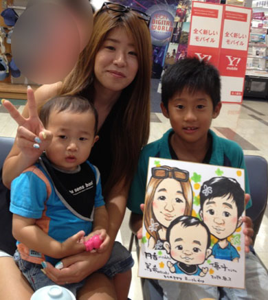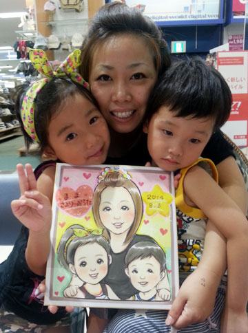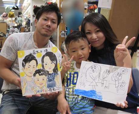 素敵な家族さんの似顔絵を描かせて頂きました。お子さんは絵が大好きということで、かなりの大作を描いて下さったので、一緒に記念撮影してみました。