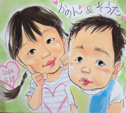 ☆兄妹ちゃんの似顔絵です。お兄ちゃんの笑顔がみているこっちまで思わず笑ってしまいたくなるくらい可愛いです。妹ちゃんの「?」という表情がこれまた愛らしくて!これからも仲良く育って下さいね。