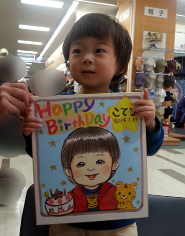 可愛いお子さんの似顔絵ですね。お誕生日の記念かな。これからも元気に育っていってね。