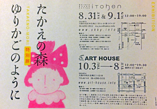 大阪市内二か所のギャラリーでテーマを変えて展示し、後半のARTHOUSEでは、新作公開をメインにペン画や雑貨等、様々な手法で表現した「今」の彼女を知れる6日間です。
