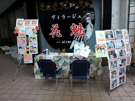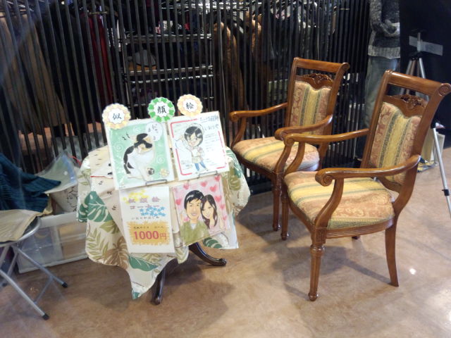 建物の中での似顔絵コーナーでとっても素敵なセッティングをして頂きました。お洒落なショップに囲まれて、綺麗なものを見ながら描かせて頂きました。元大工のアンティーク家具を作っていらっしゃる方やブリザートフラワーの販売など。