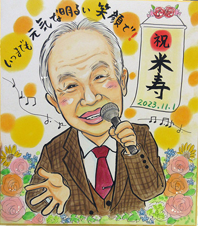 米寿のお祝い似顔絵をご依頼いただきました。カラオケが好きなのだそうです。