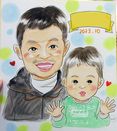 お父さんと息子ちゃんの似顔絵。奥さんと娘さんには内緒で描いてたのですが、後からお二人も合流して、別途ご依頼いただきました。