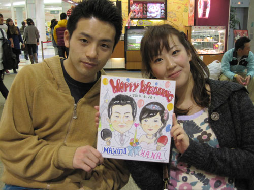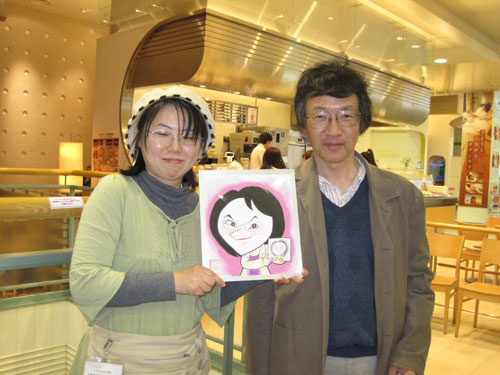 それから、上田様御夫妻にはこの悪天候の中、りんくうまで私の似顔絵を届けに来て下さいました~!!。わああお!これで三枚目です。嬉しくて、御夫婦と写真を取り巻くっていましたよ。