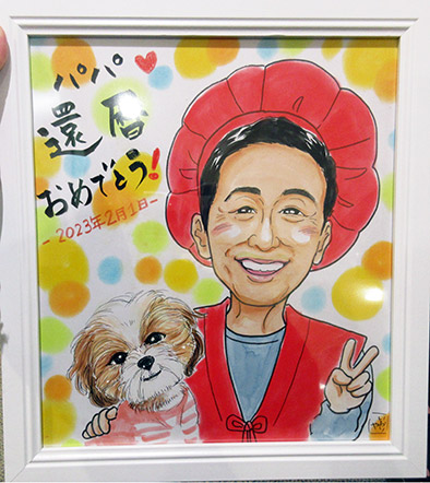 お父さんの還暦と退職祝いにというご依頼でした。ワンちゃんを溺愛されているそうで、一緒に描かせて頂きました。