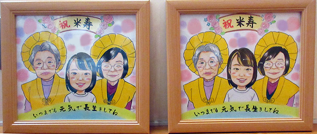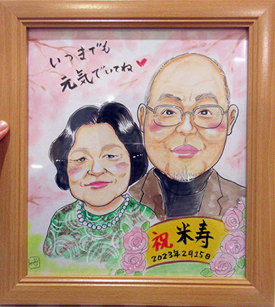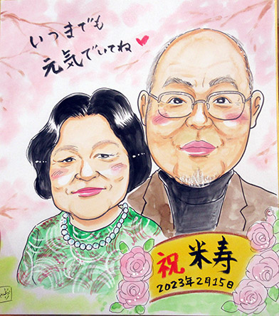 米寿のお祝いの似顔絵です。ご両親のお祝いにというご依頼でした。とても素敵なお写真のお二人だったので、春の先取りで桜を入れてみました。