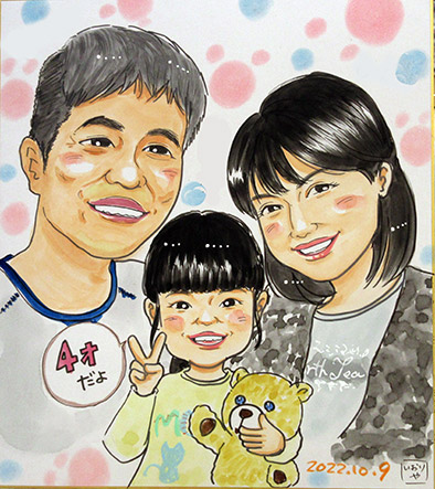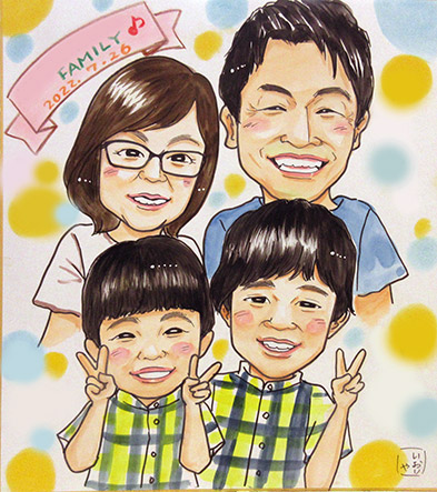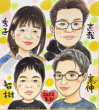 ご家族似顔絵です。初めての似顔絵だそうで、嬉しいですね〜。